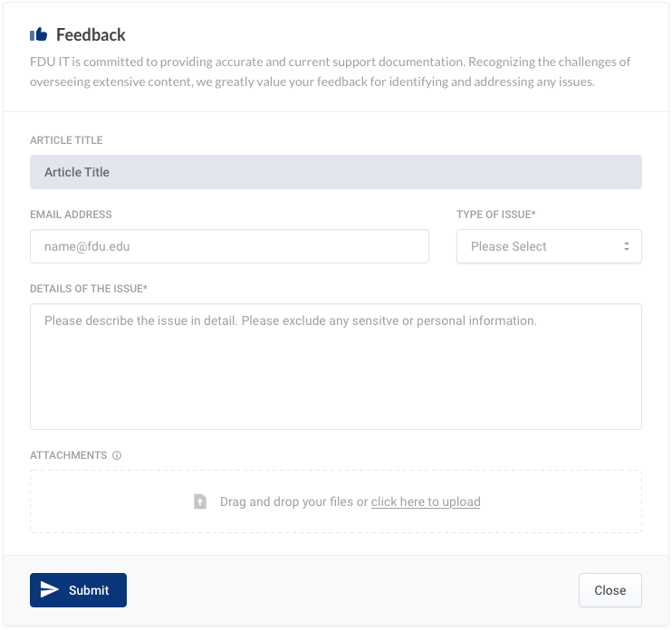 We thank you in advance for your contributions. Your insights and feedback are crucial in keeping our IT support content not only current but also reflective of our collective knowledge and experience. Together, let’s continue to foster a robust and resourceful digital environment at FDU.