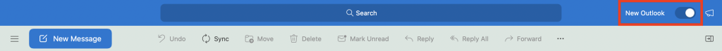Some macOS users may take advantage of the “New Outlook” version of the Outlook application. You can identify which Outlook version you are using by locating the “New Outlook” slider tab button on the top right of the application.