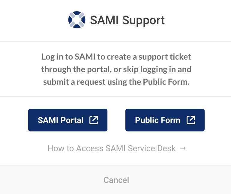 In addition to these options, there is an online request form, called the Public Form, which is intended to be used when the SAMI Support Portal is unavailable due to any of the following reasons: