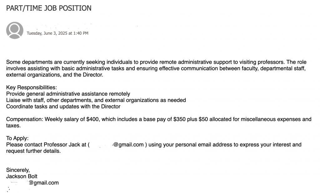 Yesterday, the FDU email domain experienced a phishing attack originating from a compromised FDU email account. The message, which falsely advertised a job opportunity assisting visiting professors, is shown below.